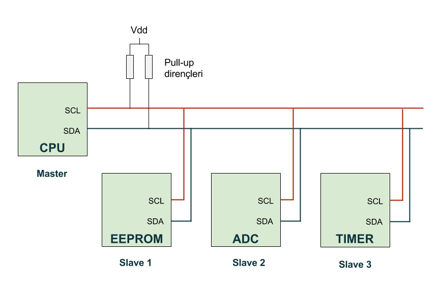 Not: I2C veri yolu üzerindeki birimler open drain veya open collector özelliği göstermektedir. Bu birimler tarafından, SDA ve SDC üzerindeki elektriksel seviye ancak aşağıya yani lojik 0 seviyesine çekilebilir, lojik 1 yapılamaz. Bu sebeple SDA ve SDC hatları birer pull-up direnciyle lojik 1 seviyesine çekilmelidir. Pull-up direnci olarak 1K ile 10K aralığında dirençler kullanılabilmektedir.